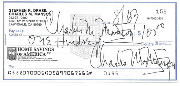 Very Scarce Charles Manson Check made out to Charles M. Manson