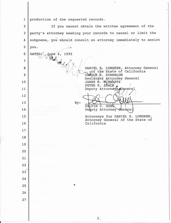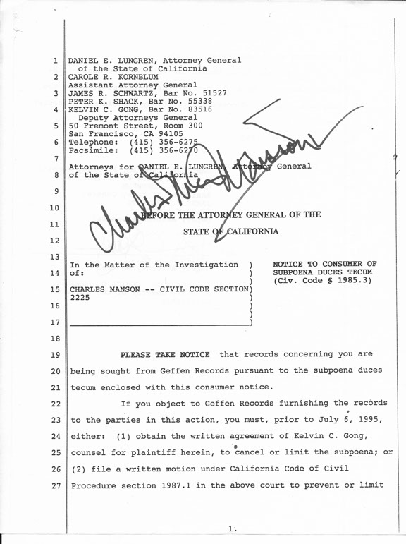MANSON, Charles (1934-2017). American criminal who led what became known as the Manson family. He is known as the "icon of evil." Charged and convicted of murder and conspiracy. Sentenced to death but that was automatically commuted to life imprisonment by a 1972 court decision eliminating the death penalty in California. He was denied parole 12 times. His net worth at the time of his death was $400,000. Document signed, two pages, June 6, 1995, Attorneys for Daniel E. Lungren, Attorney General of the State of California In the Matter of the Investigation of Charles Manson. This is in regards to Geffen Records pursuant to the subpoena....”. Boldly signed by Charles Manson incorporating a Swastika. Manson’s signature is a “10.” Very fine condition.........................$275.00