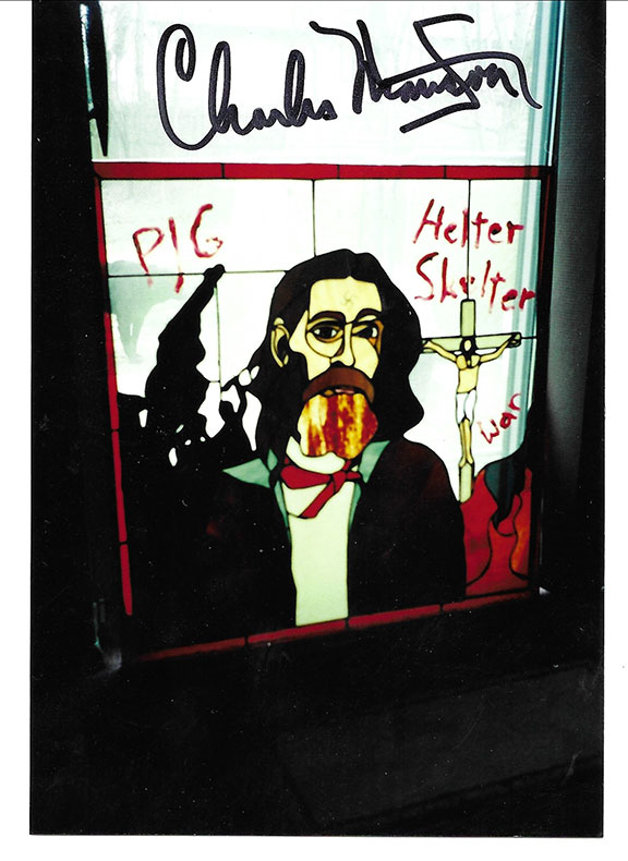 MANSON, Charles (1934-2017). Drifter whose “family” committed the infamous Sharon Tate/LaBianca murders in 1969. Two of his followers Sarah Jane Moore and Lynette Fromme were imprisoned for the attempted assassination of President Gerald R. Ford. The book “Helter Skelter” is the true story of the Manson murders. At the time of Manson’s death, he was worth $400,000. Manson sometimes described himself as the “Second Coming of Christ.” Color photograph,4”x6” of one of his paintings depicting Christ on the Cross beside him. Painted in red are the words “Pig” and “Helter Skelter.” Manson using a black ink Sharpie pen has signed his name which includes a swastika. In excellent condition.........SOLD