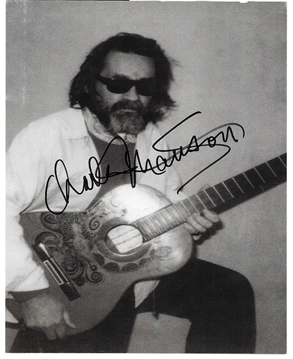 MANSON, Charles (1934-2017). American criminal who led what became known as The Manson Family. He is known as “The icon of Evil.” He was charged with murder and conspiracy. Manson was sentenced to death but automatically commuted to life imprisonment by a 1972 court decision eliminating the death penalty in California. Wonderful, B&W, 8”x10” portrait of Charles Manson holding his guitar. Signed with an unusually bold and large signature incorporating a Nazi Swastika. His guitar was confiscated by the prison warden. In excellent condition............................SOLD