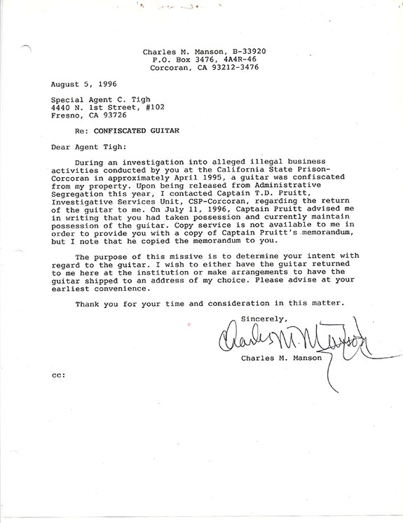 Rare typed letter signed, August 5, 1996 to Special Agent C. Tigh. Manson writes: “During an investigation into alleged illegal business activities conducted by you at the California State prison-Corcoran in Approximately April 1995, a guitar was confiscated from my property. Upon being released from Administrative Segregation this year, I contacted Captain T.D. Pruitt, Investigative Services Unit, CSP-Corcoran, regarding the return of the guitar to me. On July 11, 1996, Captain Pruitt advised me in writing that you had taken possession of the guitar. Copy service is not available to me in order to provide you with a copy of Captain Pruitt’s memorandum, but I note that he copied the memorandum to you.