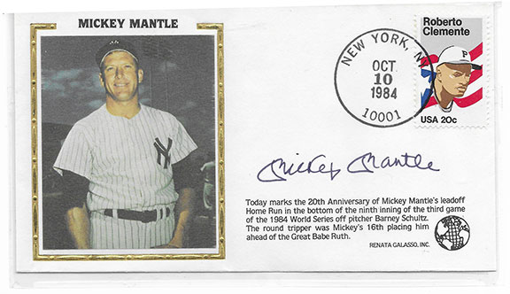 MANTLE, Mickey (1931-1995) American professional baseball player. Played for the New York Yankees for 18 seasons. Very attractive cover commemorating Mickey Mantle. Choice colorful cachet of Mickey Mantle in uniform. This cover marks the 20th Anniversary of Mantle’s leadoff Home Run in the ninth inning of the third game of the 1984 World Series. Most interesting the typo on this cover should read 1964 not 1984. Affixed is a Roberto Clemente US 20 cent postage stamp, cancelled New York, Oct 10,1984. Hand signed by Mickey Mantle with a signature grading a 10. This cover is in excellent condition.....................$250.00