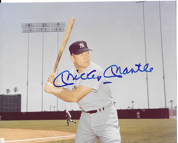 MANTLE, Mickey (1931-1995). American professional baseball player. Played his entire career with the New York Yankees (1951-1968). Was the greatest power and switch hitter in baseball history. Inducted into the Baseball Hall of Fame in 1974. Fantastic (uncommon portrait) Copyright, T.V. Sports Mailbag, of Mantle ready to swing his bat with a beautiful signature nearly six inches long. In mint condition..................$275.00 |