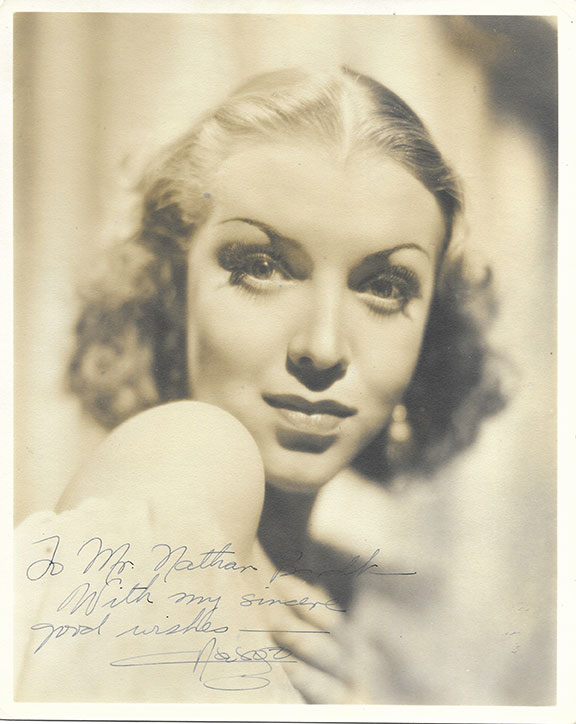 Margo (born MarĂa Marguerita Guadalupe Teresa Estela Bolado Castilla y O’Donnell, May 10, 1917 - July 17, 1985) was a Mexican actress and dancer.[She appeared in many film, stage, and television productions, including Lost Horizon (1937), The Leopard Man (1943), Viva Zapata! (1952), and I'll Cry Tomorrow (1955). She married actor Eddie Albert in 1945 and was later known as Margo Albert. Fine, close-up full-face pose, vintage double weight photograph 8”x10”, inscribed and signed: “To Nathan Bardt, with my sincere good wishes- Margo.” Not a common signed photograph.....................$195.00