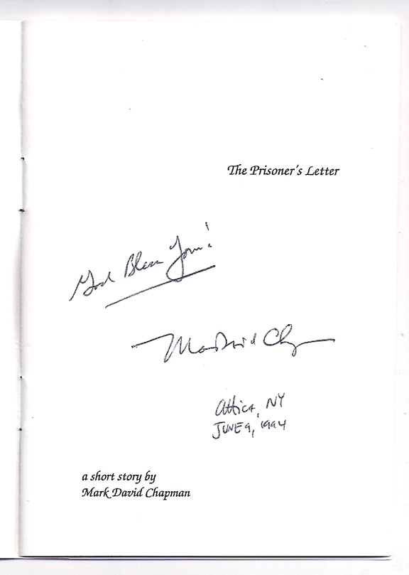 CHAPMAN, Mark David (1955- ). Former security guard who shot and killed John Lennon (1980). His book: The Prisoner’s Letter, Copyright 1992, First printing. This booklet is dedicated to the Lord Jesus Christ, whose historically recorded resurrection had made it possible. Twenty pages. On the title page Chapman has written: “God Bless You! Mark David Chapman, Attica, N.Y. June 9, 1994”. In mint condition................SOLD