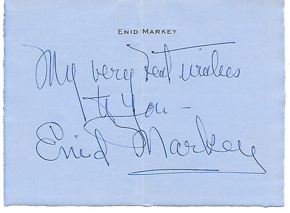 Markey, Enid (1894-1981). American actress of stage, film and television. She created the role of “Jane” in the first Tarzan movie in 1918. William S. Hart’s leading lady in “The Darkening Trail” (1915). She rode bare back and twirled her six-shooter. Her last film appearance was in “The Boston Strangler” (1968). Very uncommon autograph note signed in full on her name imprinted note paper. "My very best wishes to you- Enid Markey." In very good condition.............$85.00