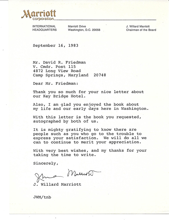 MARRIOTT, J. Willard (1900-1985). Mormon, Founder of the Marriott Corporation, world’s largest hotel chain. He started his business in 1927 and built his first hotel in 1957. Uncommon typed letter signed on Marriott Corporation imprinted letterhead, J. Willard Marriott, Chairman of the Board. September 16, 1983. Friendly letter sending thanks about his Key Bridge Hotel and also glad the recipient enjoyed the book about Marriott’s life. He continues: “It is might gratifying to know there are people such as you who go to the trouble to express your satisfaction. We will do all we can to continue to merit your appreciation..” Signed “J. Willard Marriott.” In fine condition.............. $85.00