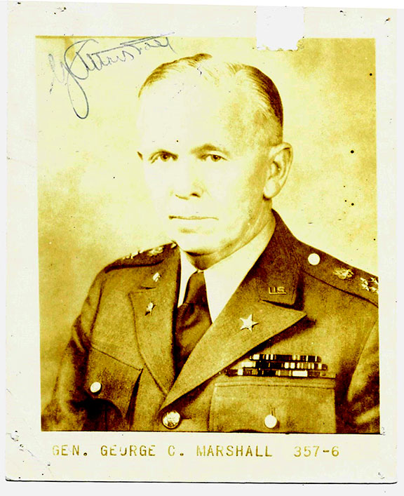 MARSHALL, George C. (1880-1959) Headed the largest Army in History. Chief of Staff throughout WWII (1939-1945) under FDR and Truman, Secretary of State (1947-49) under Truman. Marshall was head of the delegation to the coronation of Queen Elizabeth II. He was the only non-royal seated at the Queen Elizabeth table. Photograph, head, and shoulders pose in uniform, looking directly into the camera. Signed: “G.C. Marshall.” A few small staple holes in 3 corners and a small piece of tape that was removed from top right left which removed a small piece of the surface of the photo otherwise in good condition and rather scarce.........$325.00