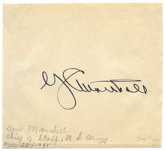 MARSHALL, George C. (1880-1959) U.S. Army General, proposed Marshall Plan for European relief for which he won the Nobel Peace Prize (1953). U.S. Secretary of State and U.S. Secretary of Defense. Choice large and bold signature with ample margins for framing. Dated in pencil by another hand Mar.23, 1941 at the lower right..............SOLD![]() |