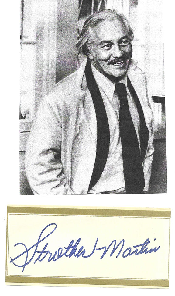 MARTIN, Strother (1919-1980). American actor who often played a grimy, unlikable villain. He appeared in numerous film “True Grit” with John Wayne and “Cool Hand Luke” with Paul Newman. He appeared in dozens of TV series such as “Gunsmoke,” “Bonanza,” “The Virginian,” “Gilligan’s Island,” “Perry Mason,” and ‘The Twilight Zone.” Choice, bold signature on a label with gold edges. Ample margins for framing.......................$175.00 |
