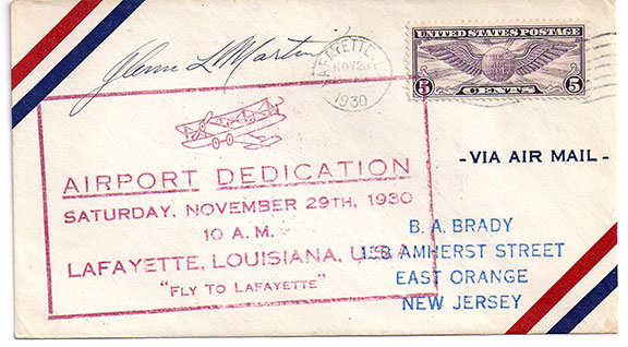 MARTIN, Glenn L. (1996-1955). American aircraft designer and manufacturer. Martin Bomber designed during WWII was the standard in the Army Air Force. Pioneer in building large transoceanic flying boats. He was an early bird and by 1911 he became one of the best known flyers in the United States. He established one of the first airplane factories. Uncommon Air Mail cover with a five cent Air mail stamp affixed postmarked Lafayette, Louisiana, Nov. 29, 1930. Dedication of the Lafayette Airport stamped cachet. Signed across the top of the cover “Glenn L. Martin”. Rather attractive item......................... $225.00