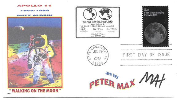 MAX, Peter (1937- Rumors say he may have died August 26,2023). American artist of German and Jewish origin. His work is associated with the culture of the 1960’s, particularly psychedelic and pop art. Max’s wife Mary who committed suicide in 2019, along with her husband, allegedly siphoned 4.6 million dollars in cash from a relative. Wonderful First day Cover of the 1969 Moon Landing with a colorful cachet by Peter Max, of Apolo 11, with Buzz Aldrin Walking on the Moon. A 1969 First Moon Landing postage stamp cancelled Cape Canaveral, JUL 19, 2019 and hand signed by Peter Max during a book signing. In Mint condition.................$135.00