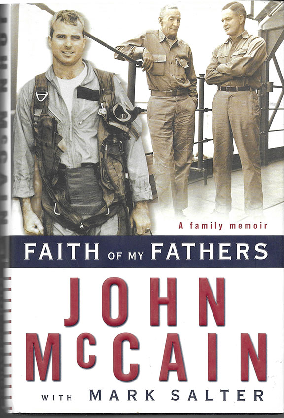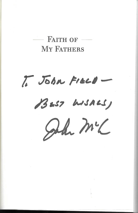 McCAIN, John (1936-2018). Naval aviator, held as a prison of war in Viet Nam and was tortured. U.S. Senator who was the Republican Party’s nominee in the 2008 U.S. Presidential election. His book: “Faith of my Fathers” Random House, 1999, later printing. Three hundred fifty pages. Inscribed and signed on the half title page: “To John Field-Best Wishes John McCain.” In fine + condition with near fine dust jacket...........$29.50 |