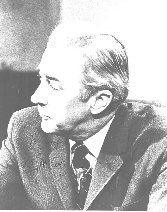 McCARTHY, Eugene Joseph (1911-2005). American politician who sought the Democratic presidential nomination in the 1968 election. He ran unsuccessfully for U.S. president four more times. He worked with Che Guevera in New York City to discuss repairing relations between the U.S. and Cuba. Uncommon signed 8”x10” B&W photograph, half length looking to his right. Inscribed and signed in the dark area of his suit: “To Doug E.J. McCarthy.” In very fine condition...........$65.00 |