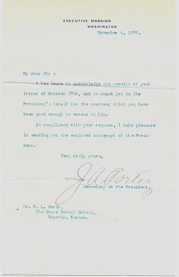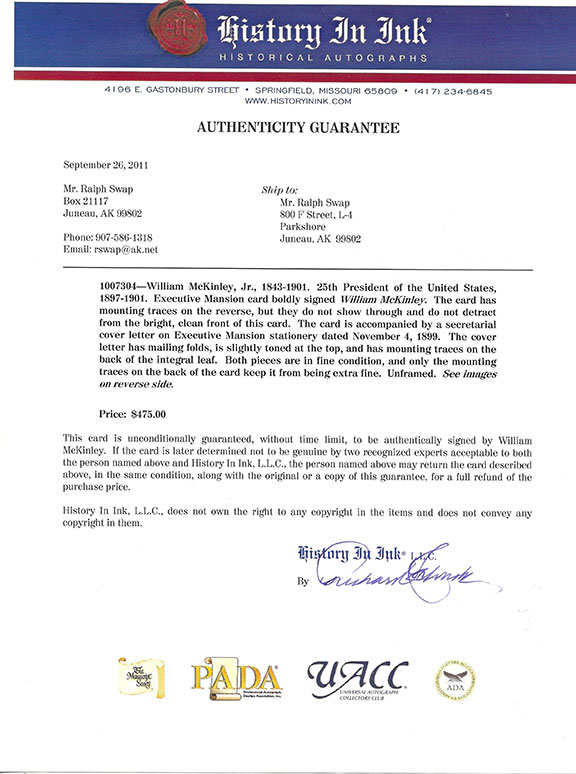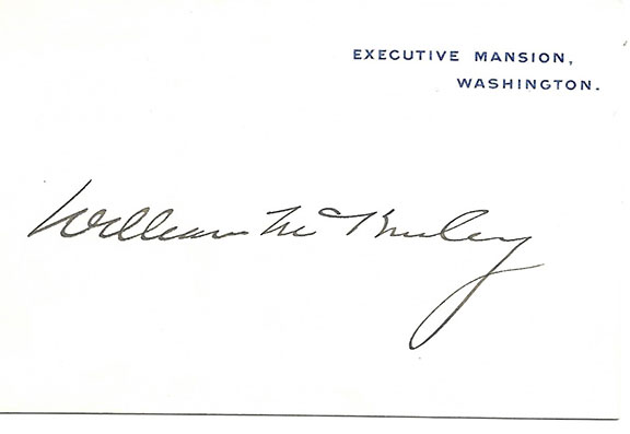 McKINLEY, William (1843-1901). President of the United States (Mar. 4, 1897-1901). Assassinated by gun shot. Fabulous Executive Mansion card. Measures 2x75”x3.25 inches bearing a highly sought after signature of McKinley on these cards. Together with a T.L.S. on Executive Mansion letterhead dated November 4, 1899 signed by J.A. Porter sending the autographed card. Added is a COA from History In Ink. Except for a small handful of Executive Mansion cards signed By Theodore Roosevelt, Mc Kinley cards are the last to be signed in the 20th century by a president...........$795.00