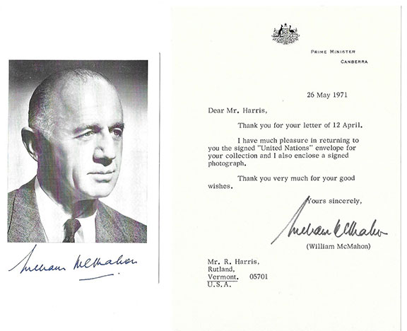 McMAHON, Sir William (1908-1988) Twentieth Prime Minister of Australia (1971-1972). Leader of the Liberal Party. Described as one of the worst Prime Minister’s. His memoirs was rejected by six publishers. T.L.S. 26 May 1971 as Prime Minister sending a signed photo to a collector in Vermont. The signed photo is enclosed. The two items in near mint condition........SOLD![]() |