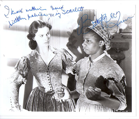 McQUEEN, Butterfly (1911-1996). Popular actress and dancer. At the age of 13, she joined a Harlem theater group. She was nicknamed Butterfly after appearing in a production of A Midsummer Night’s Dream, in which she danced the Butterfly Ballet. She is best remembered for her appearance as a black maid in Gone With The Wind. She also appeared in the Academy Award winning movie Mildred Pierce (1945) and other fine movies. She won an Emmy in 1980 for her performance in a childrens production The Seven Wishes of a Rich Kid. In Gone With The Wind as Atlanta burned, Scarlett O’Hara turned to her squeaky-voiced, tearful maid “Prissy” who had boasted her skills as a mid-wife. Prissy responded with one of the most famous lines in any movie. Photograph, 10”x8’, B&W, scene from Gone With The Wind standing with Vivien Leigh. Boldly written across the upper portion of the photograph: “I know nothing ‘bout birthin babies, Miz Scarlet, Butterfly McQueen”. On the verso she has also written: “Vivien Leigh-Scarlett, deceased”.