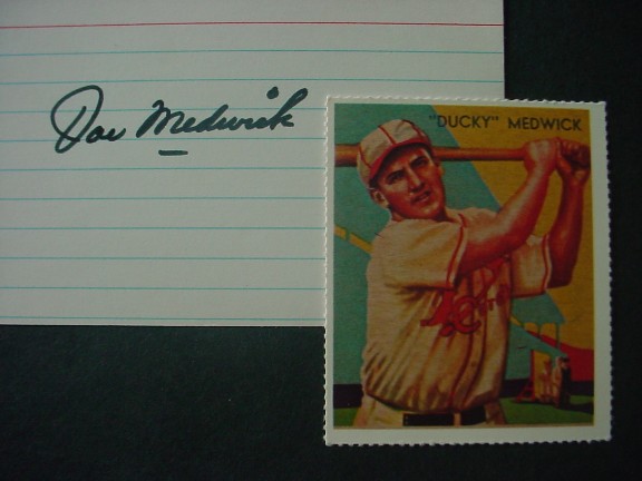 MEDWICK, Joe. (1911-1975). Member of the Baseball Hall of Fame. A fabulous signature on the lined side of a 3 in. by 5 in. card. Together with a Diamond Stars 366 card. $110.00