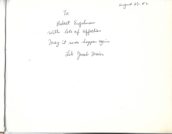 MEIER, Lili Jacob (1926-1999). Jew deported with her family to Auschwitz. She survived the death camp, her family was sent to the gas chambers. Her book: “The Auschwitz ALBUM.” Random House (NY)1981, First Edition, hardcover, 167 pages, heavily illustrated with gruesome images. Very rare presentation inscription by the author: “August 29, 82 To Robert Engleman, with lots of affection May it never happen again, Lili Jacob Meier. This book itself is quite scarce and signed copies are extremely rare. In very good condition..............................$350.00