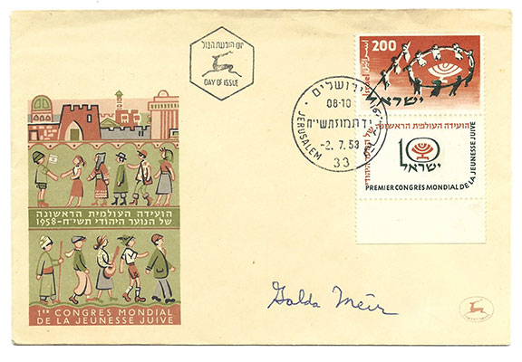 MEIR, Golda (1898-1978). Russian born-American raised Israeli politician and political leader. She signed the Scroll of Independence in 1948. She cried uncontrollably as she signed the Scroll. Meir was Prime Minister of Israel (1969-1974) and she led her country in the October 1973 war against the Arabs. Early First Day Cover commemorating the First Congress Mondial De La Jeunesse Juive. The First Congress postage stamp is cancelled Jerusalem. 2/7/1953 and the cover is signed by Golda Meir in English. In fine condition.......................$350.00