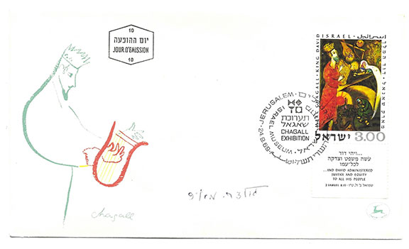 MEIR, Golda (1898-1978). Russian born-American raised Israeli politician and political leader. She signed the Scroll of Independence in 1948. She cried uncontrollably as she signed the Scroll. Meir was Prime Minister of Israel (1969-1974) and she led her country in the October 1973 war against the Arabs. First Day Cover commemorating the Chagall King David postage stamp. Postmarked Chagall Exhibition, Jerusalem Chagall Exhibition, Israel Museum 24/9/69. King David by Chagall printed cachet on the left and signed in ink, in Hebrew by Golda Meir. In choice condition and rather unusual.......................$350.00