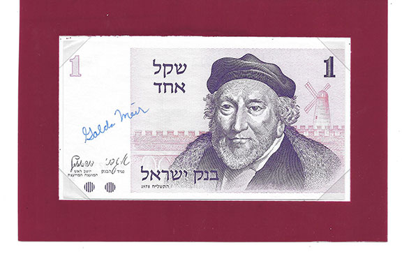 MEIR, Golda (1898-1978). Russian born-American raised Israeli politician and political leader. She signed the Scroll of Independence in 1948. She cried uncontrollably as she signed the Scroll. Meir was Prime Minister of Israel (1969-1974) and she led her country in the October 1973 war against the Arabs. Mint example of Israeli currency, hand signed for a collector who obtained this signature in person in Israel. Very attractively mounted (easily removed) and a perfect example for framing along with your favorite photo of Golda Meir................................$235.00