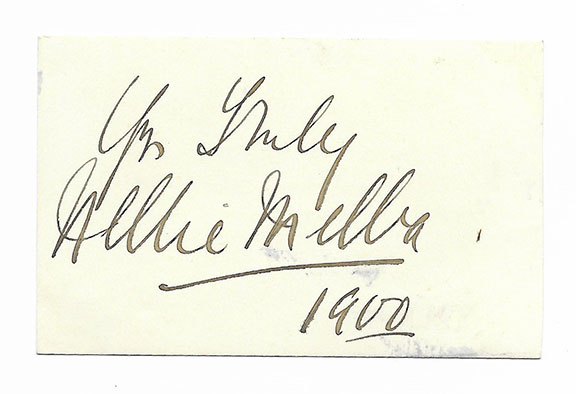 MELBA, Nelli (1861-1931). Operatic soprano. First appeared in New York (1893) later toured the U.S. Prima Donna at the Royal Opera. Created “Dame” of the British Empire (1918). Two word sentiment and bold signature, dated “1900” on the verso of her trimmed calling card. Ample margins for matting and framing....$87.50![]() |