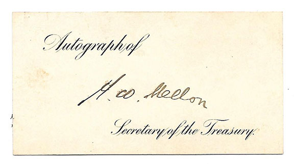 MELLON, Andrew W.  (1855-1937). American financier, Secretary of the Treasury (1921-32) under Harding, Coolidge and Hoover. One of the richest men in the United States. Partly printed engraved card of the Secretary of the Treasury. Signed “A.W. Mellon ................................