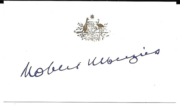 MENZIES, Sir Robert  (1894-1978).  12th Prime Minister of Australia (1939-1941) and again (1949-1966).  Australia’s longest serving prime minister.  Official card of the Prime Minister with the Coat of Arms of Australia in gold, raised. Boldly signed by Robert Menzies........