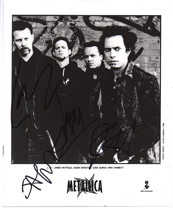 METALLICA Popular musical group. Promotional photograph by Elektra Entertainment, 8”x10”, B&W, of the group taken in 1996. Very boldly signed by James Hetfield, Jason Newsted, Lars Ulrich and Kirk Hammett, all with their usual first names. Contrast is very good. The group signed this photograph on December 21, 1996...................................SOLD