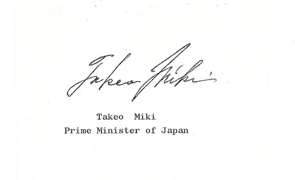 MIKI, Takeo  (1907-1988). Japanese politician who served as the 41st Prime Minister of Japan (1974-76). He resigned over the Lockheed bribery scandals. He held several political offices. Choice full signature on a large card. Not a common signature