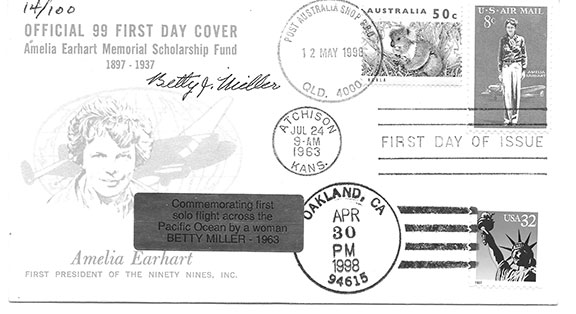 MILLER, Betty J. (1926-2018). First woman to fly solo across the Pacific. She flew a twin-engine piper from Oakland, CA to Brisbane, Queensland, Australia during May 1963. She was also the first female to fly solo from Oakland to Honolulu. She is known as the “Wonder Woman.” Official Ninety-nine FDC, Amelia Earhart, President. This is copy #14 of only 100 signed copies. Affixed to the right corner is a U.S. 8 cent Air Mail, Amelia Earhart stamp cancelled First Day of Issue. In addition is a 50 cent Australian stamp and a U.S. 32 cent stamp. Both stamps are cancelled. Amelia Earhart cachet at the left of the cover. Signed: “Betty J. Miller.” A fine example...........$95.00
