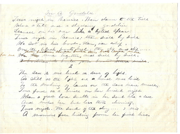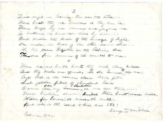 MILLER, Cincinnatus (1837-1913). Penname Joaquin Miller. American frontiersman and poet. Called “Poet of the Sierras.” He lived with the Indians and horse thieves in California and Oregon. He was a Pony Express messenger and later turned Indian fighter before turning to poetry. He was also called “The Byron of Oregon.” Original holograph manuscript draft of Miller’s “In A Gondola.” Two full pages, four stanzas, eight lines each. Hand signed “Joaquin Miller” and dated “Venice 1874.” In fine condition. Most unusual.................$450.00