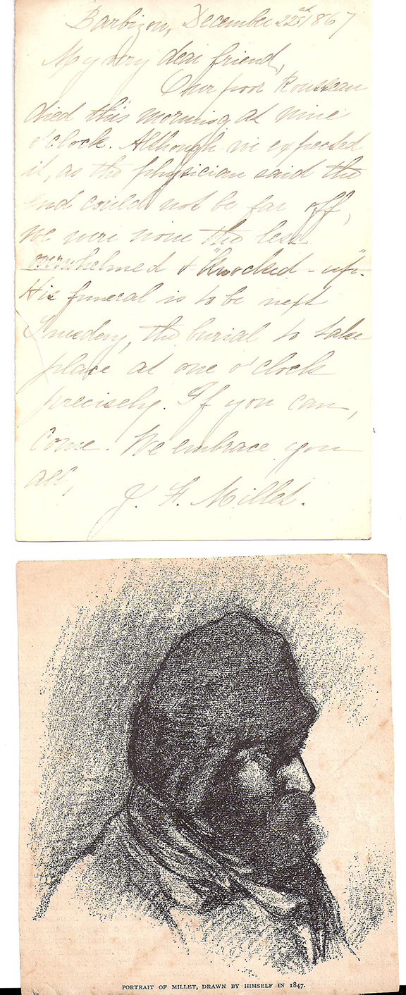 MILLET, Jean Francois (1914-1875). Famous French landscape painter of the Barbizon School. Especially noted for his masterpiece The Angelus. In 1890 The Angelus sold for $150,000. Autograph letter signed, one full page, Barbizon, Dec. 22, 1867. To “My Very dear Friend”. We quote the letter in full: “Our poor Rousseau died this morning at nine o’clock. Although we expected it, as the physician said the end could not be far off, we were non the less overwhelmed and knocked up. His funeral is to be next Tuesday, the burial to take place at one o’clock precisely. If you can, come. We embrace you all. J.F. Millet.” A very fine example of a desirable autograph with excellent content of one major artist referring to the death of his dear friend Theodore Rousseau, the noted French landscape painter and leader of post-impressionists and identified with the Barbizon School. A scarce example. Together with a printed portrait of Millet which was drawn by himself in 1847......... SOLD