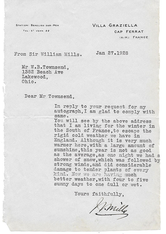 MILLS, Sir William  (1856-1932).  British developer during 1915 of the Allies most ubiquitous hand grenade of WWI known as the Mills Bomb.  In 1885 he established in the UK the first aluminum foundry and produced some of England’s earliest aluminum golf clubs. He was Knighted in 1922.  Fine typed letter signed regarding an autograph request and sends details about the weather in France compared to England.  A rather scarce autograph.....................$95.00