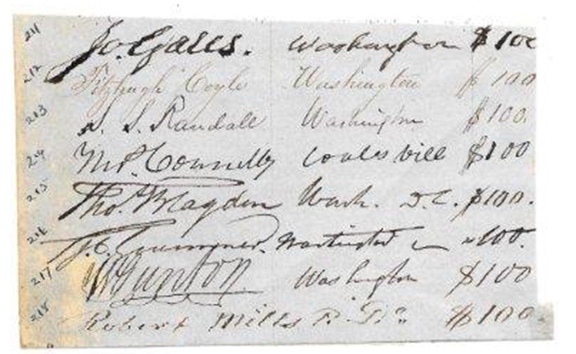 The Washington Monument cornerstone was laid on July 4, 1848 and Mills used the same trowel that George Washington had used to lay the cornerstone of the U.S. Capitol in 1793. The monument was opened to the public on Oct. 9. 1888. Robert Mills is also responsible for the first systematic mapping of a U.S. State (South Carolina). Eight signatures of early Washington, D.C and the area of notables who made a subscription for lots of land. of $100.00. The signature of Robert Mills is extremely rare.................... $395.00