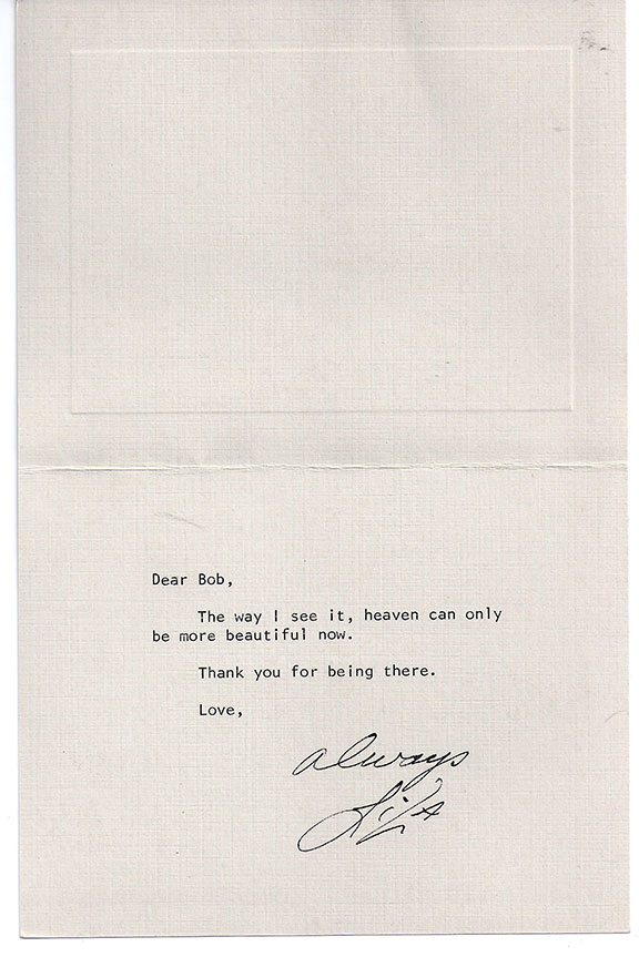 MINELLI, Liza (1946- ) Actor, singer and dancer and daughter of Judy Garland. One of a few who have won Oscars, Emmy’s, Tony’s and Grammy Awards. Her third husband was Mark Gero (1979-1992). Note card with names printed on front cover “Liza and Mark Gero”. Typed note on inside panel: “Dear Bob, The way I see it, heaven can only be more beautiful now. Love”. Liza has added in her hand: “Always, Liza”. With original envelope addressed to Robert Orth (President of American Film Archive) postmarked New York, Aug. 4, 1986. On July 30th Liza attended her father’s funeral. The two items....................SOLD