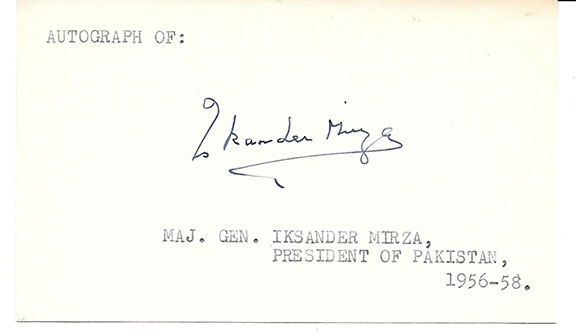 MIRZA, Iskander Ali  (1899-1969).  First President of Pakistan (1956-1958). Last Governor-General of Pakistan (1955-1956).  He once served in the British Indian Army. He ousted four Prime Ministers in two years.  His very scarce full signature on a collectors card