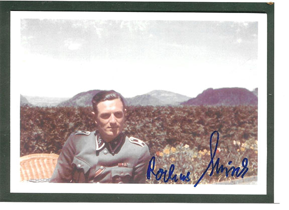 MISCH, Rochus (1917-2013). German Sergeant in the First Panzer Division, Leibstandarte SS Adolf Hitler. He served as the Fuhrer’s escort, bodyguard, courier and telephone operator for Hitler. He is reported to be the last surviving occupant of the Fuhrer Bunker. On April 30, 1945, Hitler and Eva Braun committed suicide. Misch witnessed the discovery of the bodies. He was also present when Magda Goebbels poisoned her six children and then committed suicide with her husband on 1 May 1945. Misch fled the bunker on May 2 only hours before the Red Army seized it. Color photograph of Misch possibly at Eagles nest, head and shoulders pose, in uniform. Very boldly signed......................$87.50