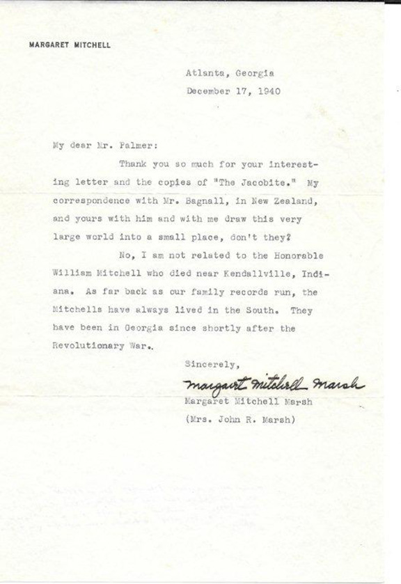 MITCHELL, Margaret (1900-1949). American novelist, author of the best selling Civil War novel “Gone With The Wind”. Typed letter signed as “Margaret Mitchell Marsh”, Atlanta, Georgia, Dec 17, 1940. One page on her name imprinted stationery, to My Dear Mr. Palmer. Mitchell writes: “Thank you so much for your interesting letter and the copies of “The Jacobite.” My correspondence with Mr. Bagnall, in New Zealand and yours with him and with me draw this very large world into a small place, don’t they? No, I am not related to the Honorable William Mitchell who died near Kendallville, Indiana. As far back as our family records run, the Mitchells have always lived in the South. They have been in Georgia since shortly after the Revolutionary War.” In fine condition......$2,500.00