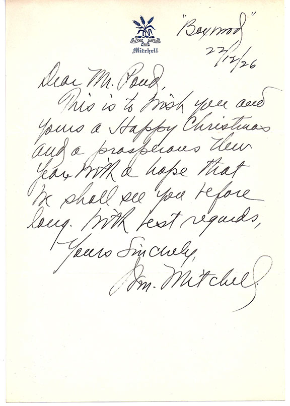MITCHELL, William (Billy). (1879-1936). American General. During WWI he rose to Brig. General. Commanded the American Expeditionary Air Force. His public criticism of military leaders for neglect of air power led to his court martial and demotion to Colonel. Resigned in 1926 but before the second World War, his main ideas were accepted. Author. Rare autograph letter signed, one page on his name imprinted letterhead. Boxwood, 22/12/26 just days before Christmas during the year of his resignation. To a Mr. Pond. In this letter he sends Holiday wishes and also wishes for a prosperous New Year and hope to see him before long. In very fine condition and Mitchell is seldom offered in A.L.S......................... $1395.00
