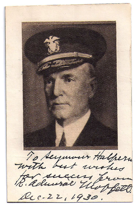 MOFFETT, William Adgar (1869-1933). American Naval Officer and Chief of Aeronautics. Founder of the U.S. Navy Air Wing. Second in command to Dewey in the Battle of Manila Bay. U.S. Commander in the capture of Vera Cruz. Recipient of the Congressional Medal of Honor. Moffett Field named after him. Printed portrait, head and shoulders pose, affixed to a card appx. 3”x5”. Signed and inscribed to Seymour Halpern (U.S. Congressman) and dated Dec.22, 1930. Autographs of R. Admiral Moffett are rare in any form........................... $175.00