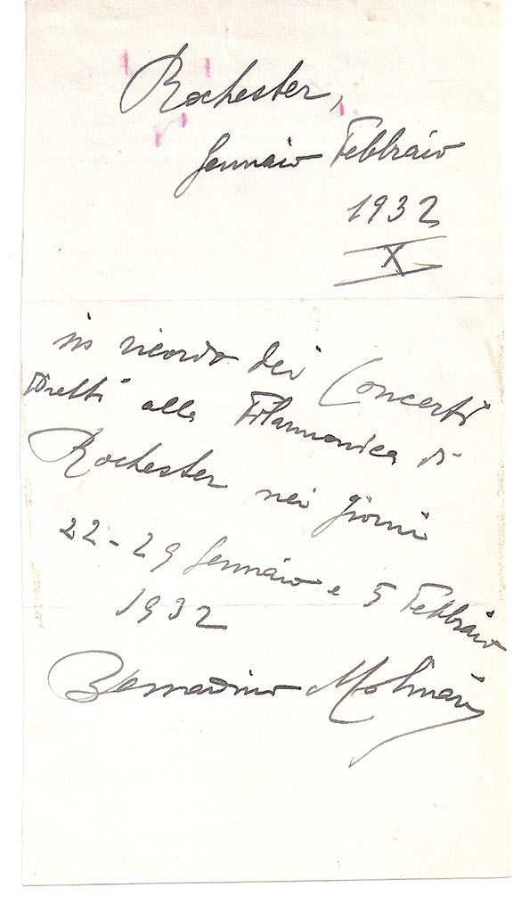 MOLINARI, Bernardino (1880-1952). Italian orchestra Conductor. Appeared with St. Louis Symphony in his American debut in 1927. Conductor of the N.Y. Philharmonic Symphony Orchestra in 1929. Autograph letter signed, one page, Rochester, Feb. 1932. Nice letter apparently mentioning the dates of his next concert. Possibly slightly trimmed otherwise a fine example, signed in full....................$95.00![]() |