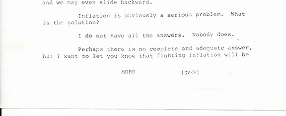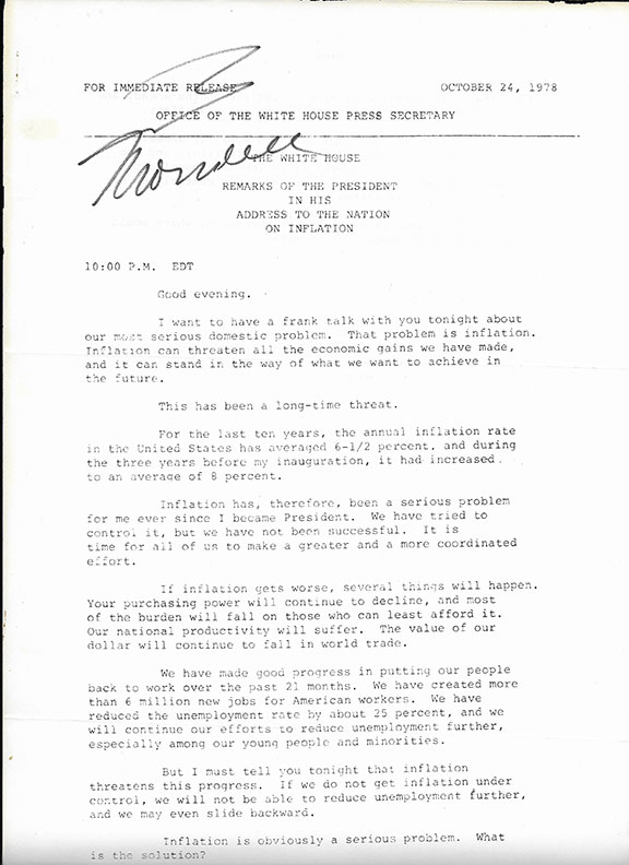 MONDALE, Walter (1928-2021) Forty-second Vice-President of the United States. (1977-1981 under Jimmy Carter). Democratic nominee for President of the United States (1984). October 24, 1978, “THE WHITE HOUSE REMARKS OF THE PRESIDENT IN HIS ADDRESS TO THE NATION ON INFLATION." For Immediate Release, Office of the White House Press Secretary. Eleven pages, legal size. Signed on the front page: “W. Mondale.” Very scarce as such....$95.00
