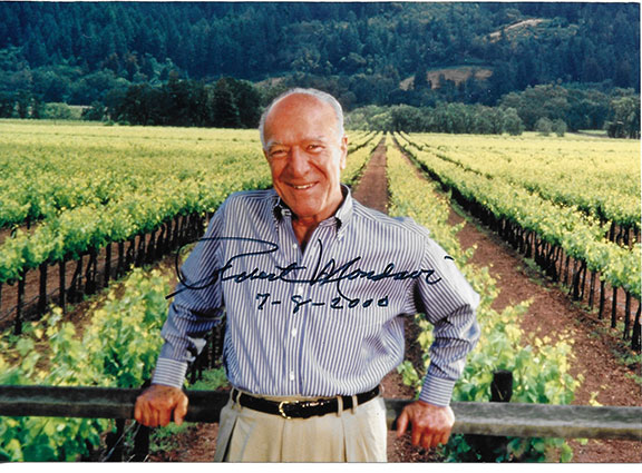 MONDAVI, Robert (1913-2008). The Father of California Winery’s. Pioneer vintner who put California wine country on the map. During 1966 he opened the winery that would turn Napa Valley into a world center of the industry. Mondavi engaged in the first French/American wine venture when he formed a partnership with Baron Philippe de Rothschild. In 1982 Mondavi and Baron Philippe began label design. For the joint venture the partners agree to choose a name of Latin origin, allowing for easy recognition in both languages. Baron Philippe announces his choice, “OPUS.” Two days later he proposes an additional word: “OPUS ONE.” A single case of the joint venture wine sold for $24,000 at the first Napa Valley Wine Auction- the highest price ever paid for a California wine. In 1985-87 sales averaged around 11,000 cases a year. Opus One becomes known as America’s first ultra-premium wine. Color photograph 5”x7” half length pose of Mondavi smiling, standing in his vineyard. Signed and dated: “Robert Mondavi 7-8-2000.” In mint condition. The first signed photograph of Mondavi we have handled..................................$135.00