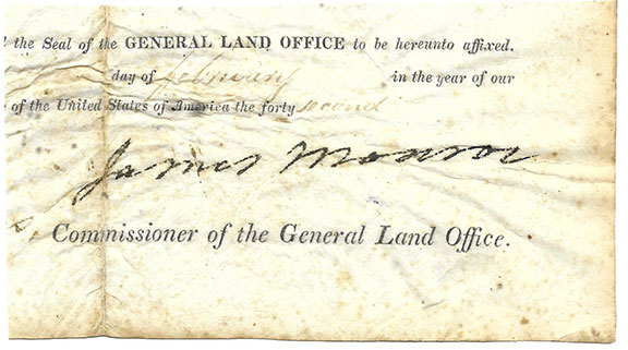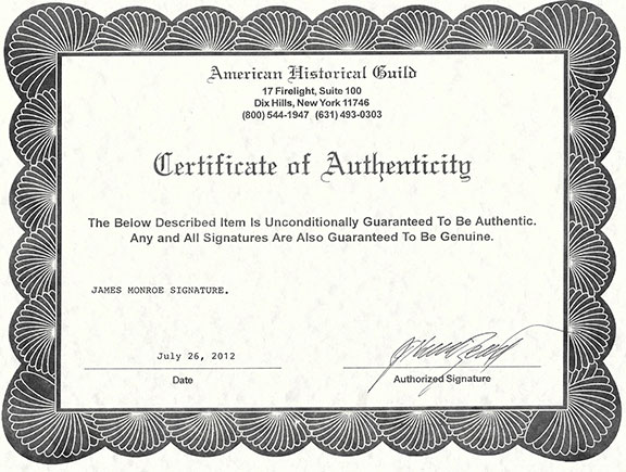 MONROE, James (1758-1831). 5th President of the United States and the last President who was a founding father of the United States. Very bold full signature on a portion of a vellum document, signed as President. Dated February 1842. One crease running through the “J” in James. Measures 3”x5”. Together with a COA from American Historical Guild...........$450.00 |