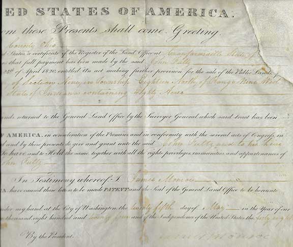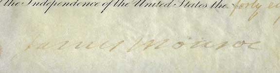 MONROE, James (1758-1831) Founding Father of the United States. Fifth President of the US. Vellum document signed, Washington, D.C. Measures 9.5”x15” dated May 25, 1824. A partially-printed land grant signed “James Monroe” and countersigned by Commissioner of General Land Office George Graham. Grant of 80 Acres in Crawfordville in the State of Indiana. Fine paper seal affixed to the lower left corner. Normal folds with one repair top right corner. Signature of Monroe a bit light yet easily read. All other writing nice and dark ..............SOLD