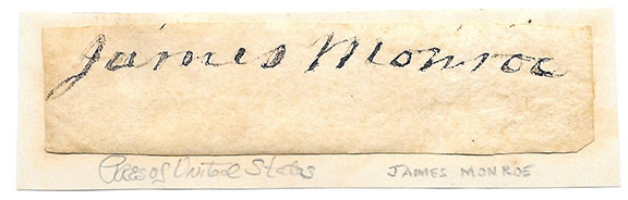 MONROE, James (1758-1831). Fifth President of the United States. Fabulous full signature on a slip of vellum. Most likely as President.................$395.00