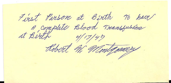 MONTGOMERY, Robert  (1947-  ? )  He was the first baby at birth to survive a complete blood transfusion. Know as “The Blue Baby.”  Large card, 3”x7” which Montgomery writes: “First Person at Birth to have a complete Blood Transfusion at Birth, 4/17/47  Robert W. Montgomery.” A very rare signature...................... $37.50