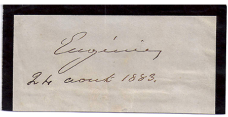 EUGENIE, MARIE DE MONTIJO (1826-1920). Empress of France as the wife of Napoleon III. She married Napoleon in 1853 soon after the Second Empire was proclaimed. She added beauty and charm to the reign but became noted for her extravagance. After 1870 she was forced to live in exile. Choice signature on a black bordered slip dated by her hand “24 Aout 1883”. Not common ............$250.00